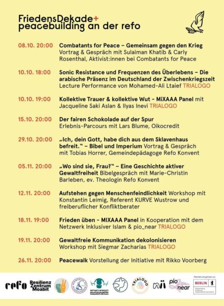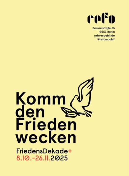 Anlässlich der Ökumenischen FriedensDekade vom 9-19.11. und deren Motto “Komm den Frieden wecken” veranstalten wir an der Refo von Oktober bis Ende November eine Peacebuilding Reihe und laden zu unterschiedlichen Veranstaltungen rund um Friedensthemen ein.