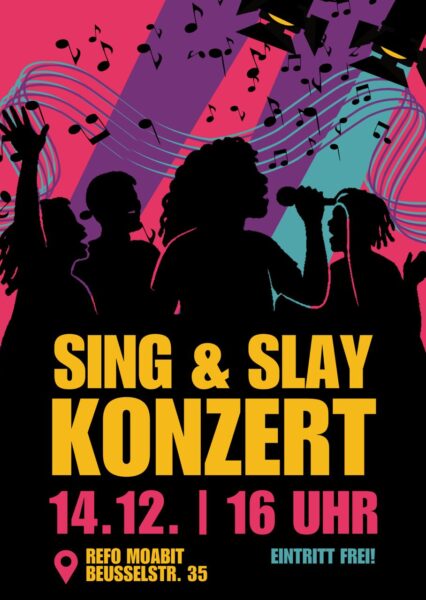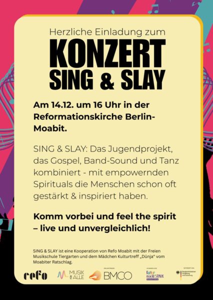 Herzliche Einladung zum Konzert von SING & SLAY am 14.11. um 16 Uhr in der Reformationskirche Berlin-Moabit. Komm vorbei und feel the spirit – live und unvergleichlich!
