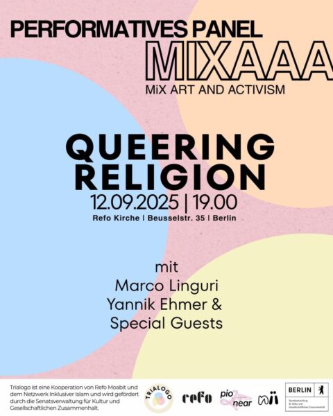 MIXAAA Panel ist ein performatives Begegnungsformat und bringt je drei Perspektiven miteinander ins Spiel. Herzliche Einladung zu QUEERING RELIGION – einem performativen Abend, der Schöpfung und Schönheit in ihrer ganzen Bandbreite feiert.