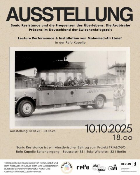 Herzliche Einladung zur Lecture Performance: „Sonic Resistance und die Frequenzen des Widerstands. Die arabische Präsenz im Deutschland der Zwischenkriegszeit“ von Mohamed-Ali Ltaief in der Refo Kapelle zur Eröffnung der Ausstellung „Sonic Resistance“.